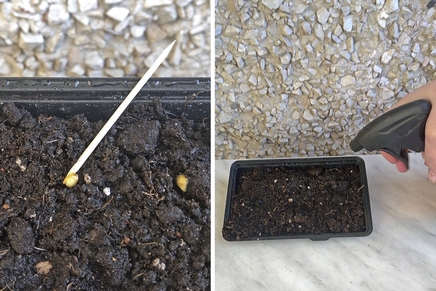 Увлажните почву теплой водой из пульверизатора, закройте емкость стеклом или пленкой и поместите в теплое – 23-25°С – место до появления всходов.