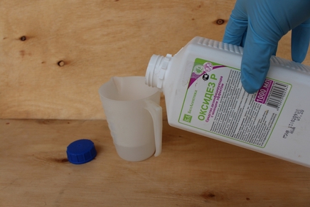 Приготовьте раствор антисептика по инструкции, используя рекомендованные средства защиты рук и органов дыхания.