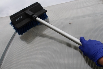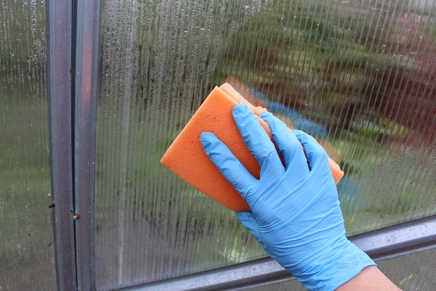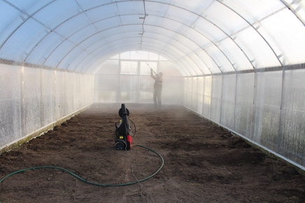 Нанесите с помощью опрыскивателя раствор дезинфицирующего средства на стены, каркас и фундамент. Затем, используя губку или мягкую щетку, помойте теплицу изнутри.