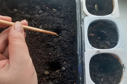 Поместите семена в емкости и заглубите на 2-3 см. Присыпьте землей.