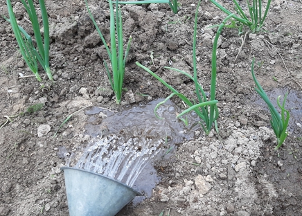 Наполните лейку водой из емкости. Аккуратно пролейте грунт вокруг растений водой из лейки, стараясь не попадать на перья лука.
