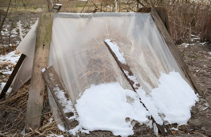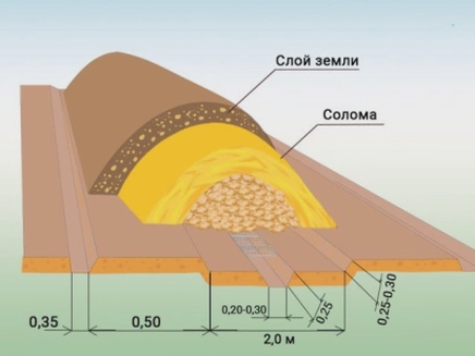 Осенью солому прикрывают слоем земли около 15 см. А с наступлением холодов слой грунта увеличивают: