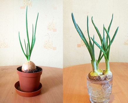 Для выгонки зелени возьмите среднего размера здоровую луковицу, срежьте у нее верхушку и слегка заглубите в почву. Можно разместить лук в стакане с водой так, чтоб воды касались лишь растущие корешки.