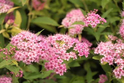 Цветет обильно с июня по август. Цветки нежно-розовые, мелкие, собраны в плоские щитковидные соцветия диаметром 3-4 см, которые густо покрывают концы побегов.