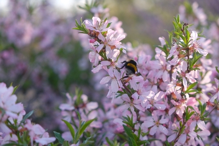 Цветки одиночные, пятилепестковые, в диаметре – до 3 см, густо покрывают все ветки. Цветение обильное, начинается одновременно с распусканием листьев). Раннее весеннее цветение степного миндаля привлекает пчел, которые собирают с него нектар.